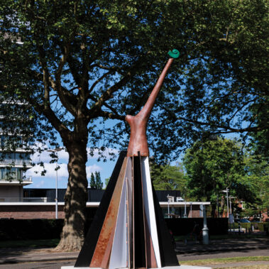 Channel Liberty (with fallen arm) is a deliberately artificial figure made of a wreath of aluminium plates and a cast iron top. The sculpture looks a bit like a costume, with a piece of tree growing out of it. The ‘fallen arm’ sticks up. At the end is a ceramic snail shell, covered with green glaze. Like shells, the snail shell is often associated with sexuality and fertility. The ability of the snail to change gender reinforces this association. In short: the snail represents feeling at home, the journey to the goal and finding your peace there. It is as if the sculpture gives birth to something from within, wants to say something. The association with the Statue of Liberty with the raised arm is not far off.