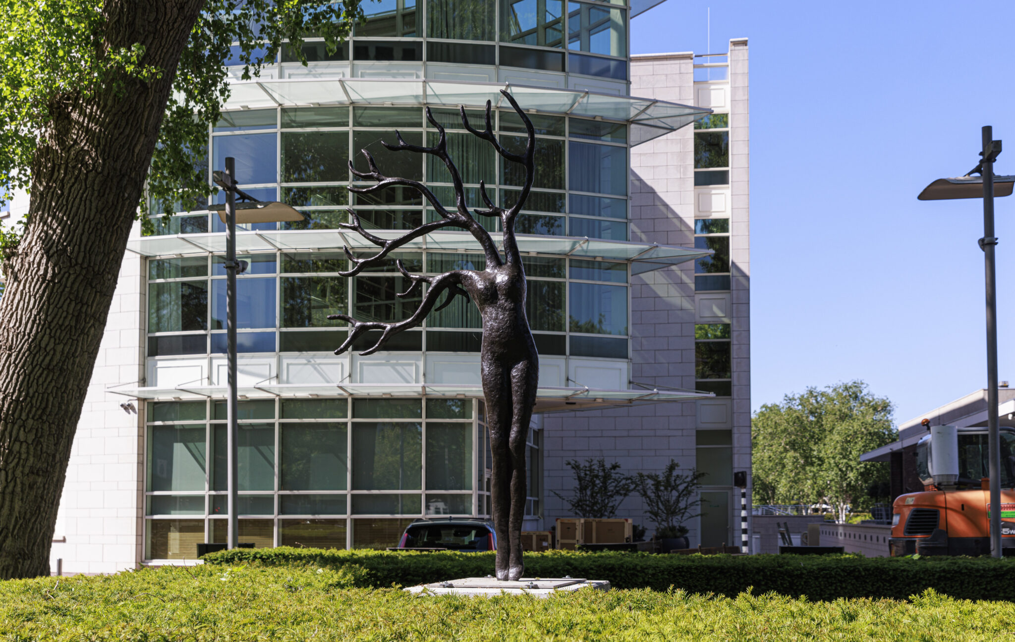 With the sculpture Daphne (ARTZUID 2025), the mythological story is told of the god Apollo who loves the beautiful nymph Daphne, but he finds no response from her. She flees and calls her father for help. Suddenly she feels her feet root in the ground and her arms change into branches: she has become a laurel tree. Daphne holds her arms up: is she desperate, or euphoric that she has finally been freed from an impossible love? Daphne’s last words seem to blow away in the wind. The German poet Rilke wrote about Daphne, and connects it with ‘amor fati’ – the love of fate. Surrender to what happens to you and do not become paralysed. Only then will you be happy.
