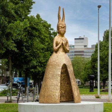 Leiko Ikemura’s oeuvre is characterised by a continuous evolution of style and themes. Her work often explores the human condition, female identity and the relationship between man and nature. She combines elements from both Japanese and Western art traditions. Her paintings and sculptures often feature hybrid figures that blur the boundaries between human, animal and landscape. These creatures embody a sense of transformation and transition. Ikemura emphasises the spiritual aspect of her work: ‘For me, one of the most important aspects of art is the spiritual dimension, although not in a religious sense. This is something I have been following for years.’ During this edition of ARTZUID, Figure with three Birds will be on display. On one side, the sculpture shows a headless figure with legs crossed on its chest. On the other side, the back appears to be a head. Three birds, which can symbolise thoughts or spiritual presence, are feeding on the figure.