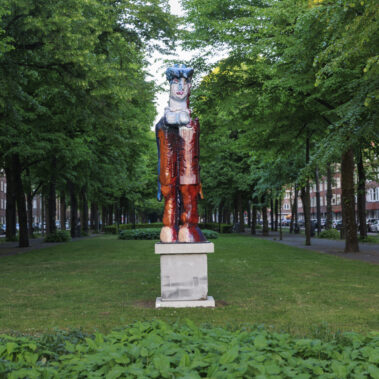 Marieke Bolhuis studied painting at the Amsterdam Rijksacademie and the AKI in Enschede. After that, she started making installations, later the human being came into the picture as a raw piece, and she also started making sculptures. Her process is intuitive, physical and driven by feeling. She uses materials from all times and recently the emphasis has been on sustainability. Her new sculpture I want to embrace you, is therefore made of cork. It will be on the Apollolaan during ARTZUID. We see a twisted figure, a movement as if struck by lightning with aluminium arms flung over the head. The sculpture SHE is GIANT on the Churchilllaan, shows a female centaur with three ochre-coloured legs and large hooves. An equestrian statue from a female perspective. So not only tough and strong but also vulnerable and beautiful on the inside. Bolhuis’ language is daring and emotionally raw, but above all she shows that vulnerability can also be strength.