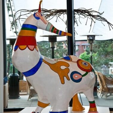 In Italy she worked for years on figures from the tarot card game. This led to the sculpture park Giardino dei Tarocchi. She also made animal figures for Noah’s Ark in Israel. Working extensively with plastic and being burdened with the constant inhalation of toxic fumes played tricks on De Saint Phalle. She therefore returned to Switzerland.