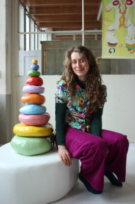 Het werk van Isa van Lier straalt een alomvattend gevoel van zachtheid en speelsheid uit, waarbij ze de toeschouwer onderdompelt in een wereld van verwondering en kinderlijke nieuwsgierigheid. Tijdens haar studie volgde ze in 2019 een uitwisselingsprogramma aan de Tokyo Zokei University in Japan. Deze ervaring had een diepgaande invloed op haar werk, met name door haar kennismaking met de Japanse kawaii cultuur, die draait om schattigheid, en het shintoïstische animisme, dat gelooft in de bezieling van natuurfenomenen en objecten. Deze elementen verwerkt ze in haar kunst door het toevoegen van gezichtjes aan objecten, waardoor ze deze bezielt en tot leven laat komen. ARTZUID toont Kettingreactie, een sculptuur die Van Lier omschrijft als een poort naar een andere wereld. Ze maakte het beeld voor het project BUILD! voor het bedrijventerrein Lage Weide in Utrecht. Deze industriële omgeving is een plek waar producten door vele anonieme handen, bewegende robotarmen en lopende banden gaan. Van Lier voelde de noodzaak om iets te creëren dat rond, kleurrijk, vrolijk en menselijk is, in contrast met die vaak vierkante, grijze en geautomatiseerde industriële wereld. De handgemaakte bollen, vervaardigd door Van Lier en haar vrienden, vormen samen een cirkel, een metafoor voor de vele schakels van een oneindig bewegende cyclus.